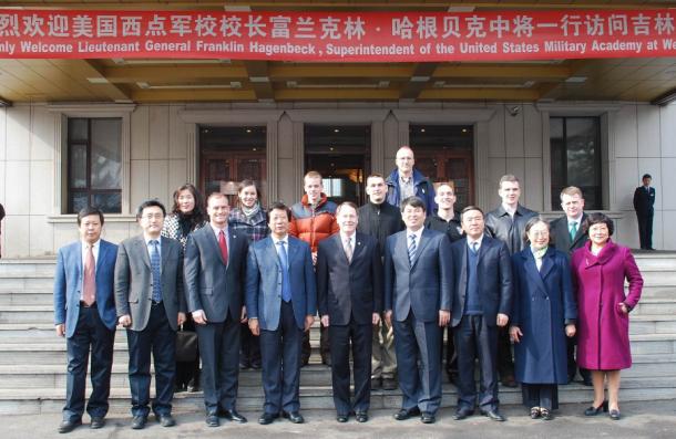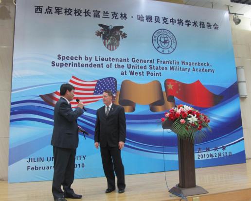 吉大自2005年起对来自西点军校的学生进行汉语培训,迄今已经培训了140名长、短期汉语研修生,两校的合作取得了良好的成果。从今年开始,欧美日本国产一区二区三区在线看将选派学生到西点军校进行短期交流,同时两校教师之间的交流也将逐步展开。与富兰克林•哈根贝克中将一同访问吉大的还有西点军校校长助理尼尔•梅奥(Neal Mayo)少校,陆军防卫部武官麦克•简瑟(Michael Janser)上校,汉语教学办公室主任葛沛迪(Brady Crosier)中校以及外国语学院王蒞文(Martha Gallagher)副教授等。