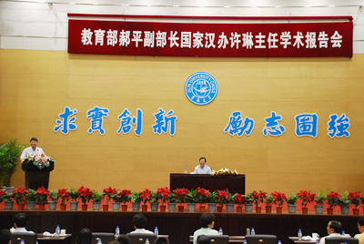 许琳为学员们作了题为《国际汉语教师的使命》的报告,她用生动、幽默的语言,大量翔实的事例围绕形势与任务、挑战与困难等方面进行了阐述,并对派出教师及培训提出具体要求。她说,作为首批培训班学员,派出教师不但要具有高度的光荣感、使命感和责任感,更要摆正心态,学会“先做学生,后做老师”。